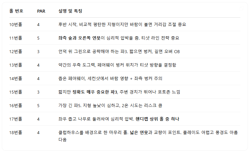 - 전략적 플레이가 요구되는 홀들이 많아 핸디캡 낮은 골퍼들도 도전 욕구 자극