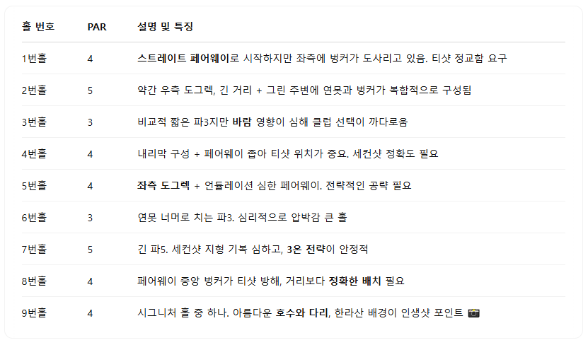 - 자연 경관과 조화로운 시그니처 홀 구성 (특히 9번, 18번)